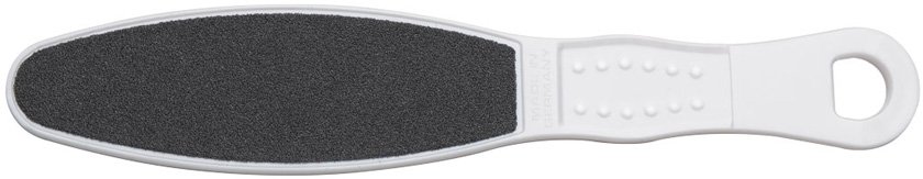 Two-sided, coarse and medium grit, plastic handle,removes stubborn calluses,  for smoothing rough, dry skin.  Cushioned abrasives eliminate friction burn.
