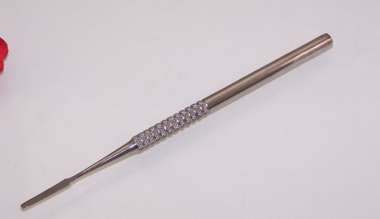 Japanese Stainless steel cuticle and pedicure pusher used to push the cuticle back without scratching the nail. Textured body will not allow the pusher to slip out of your hand.