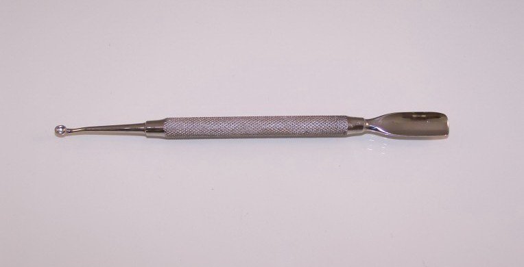 Japanese Stainless Steel Combo Cuticle Pusher. Curved-end conforms to the nail plate when pushing cuticles. Neatly helps to shape the cuticles. The Pterygium blade scrapes the hard to remove leftover skin on the nail and great for removing glue. The high hollow end is 3/8" wide. A must for the Professional