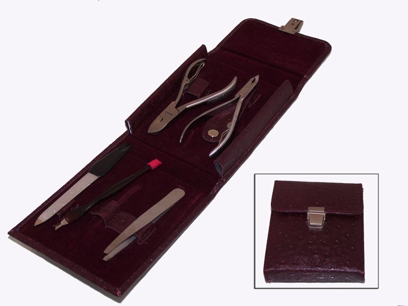 Product DescriptionPro - Manicure Kit with 5 Pieces Prestige, precision and practical describes this magnificent manicure set. Contained in a premium quality leather case, these 5 brushed stainless steel instruments meet all of a man's and women's requirements. All instruments precision ground stainless steel with brushed finish. The set contain the implements Toenail Nipper with excellent sharpness cuticle nipper high quality of stainless steel diamond nail file included the Nail pusher with plastic handle. High quality of eyebrow tweezers with brushesd finish.